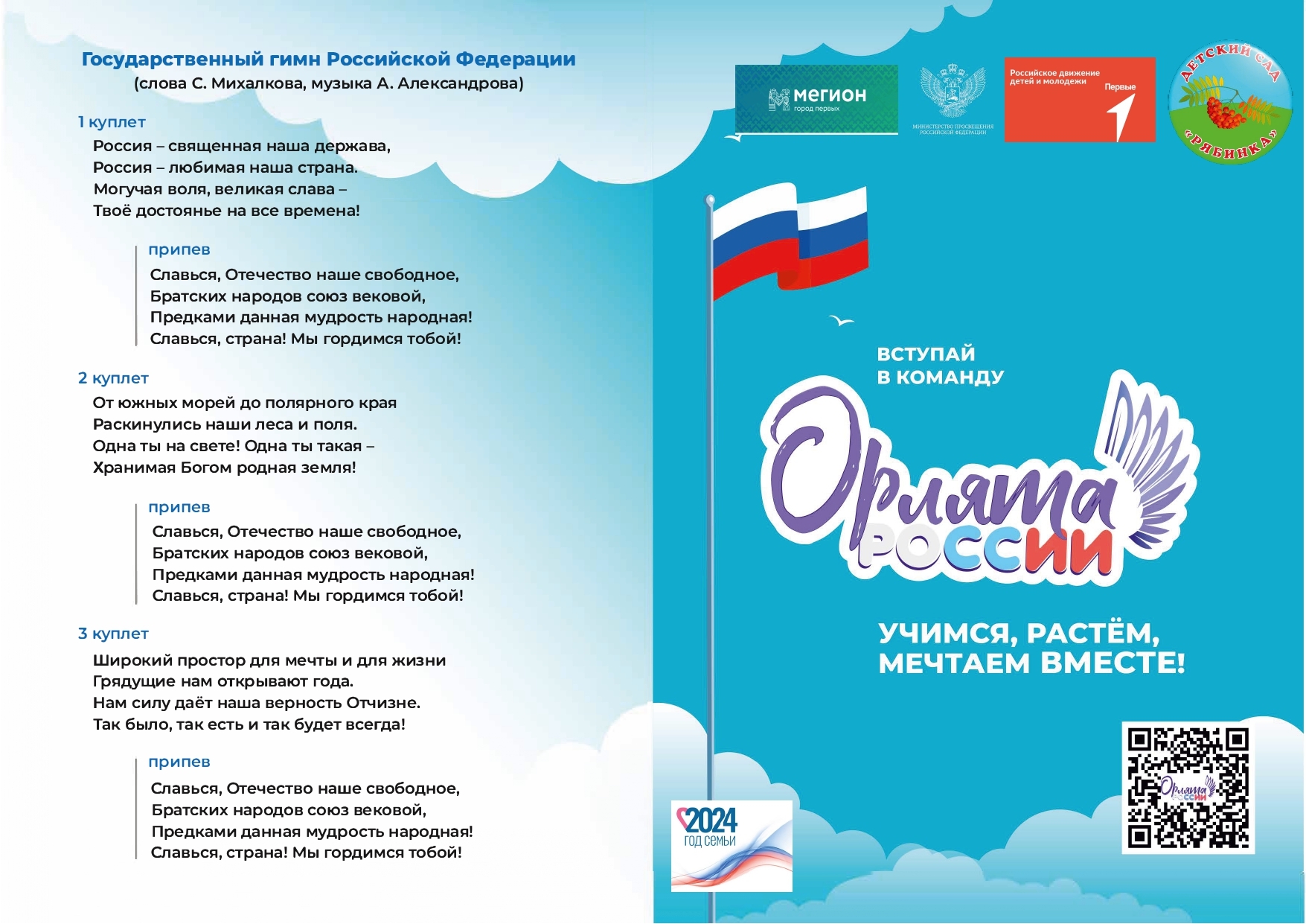 В 2023 г в МАДОУ «ДС №2 «Рябинка» организованна деятельность дошкольного отряда «ОРЛЯТА РОССИИ» как первой ступени Всероссийского «Движения Первых», в рамках реализации познавательно творческого проекта «Мы за Великую Державу!»